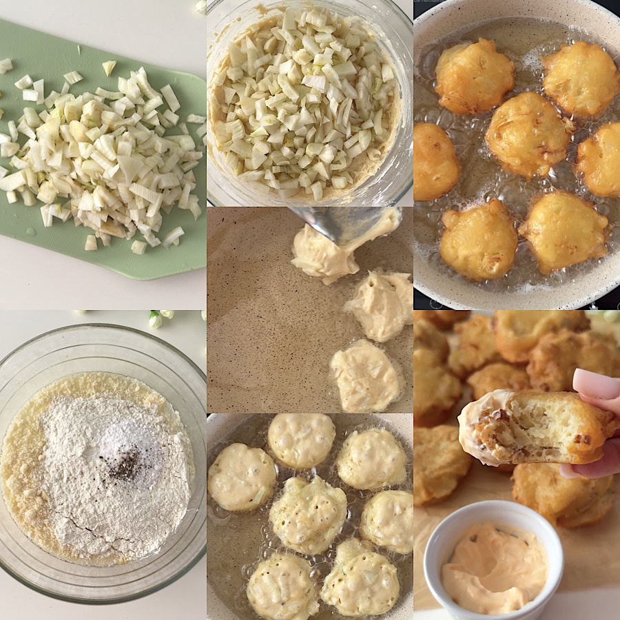 Scoop some batter with a spoon and drop it into the hot oil, let the fennel fritters cook on both sides until golden. Keep the flame medium-low, it will take less than 10 minutes in total.