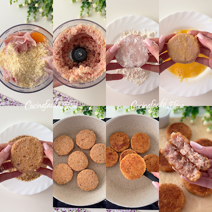• Ham cutlets are super easy and quick to prepare. First, put the slices of cooked ham, the egg, the bread crumbs, grated Parmesan cheese, a pinch of salt in a food processor, and blend all the ingredients until you get a homogeneous mixture.