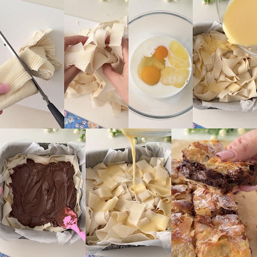 • Transfer half of the phyllo dough strips into a baking tray lined with parchment paper and pour half of the batter over them. Add a layer of Nutella (more or less generous, I used 4 tablespoons), cover with the other half of the phyllo dough, and also add the remaining batter.
