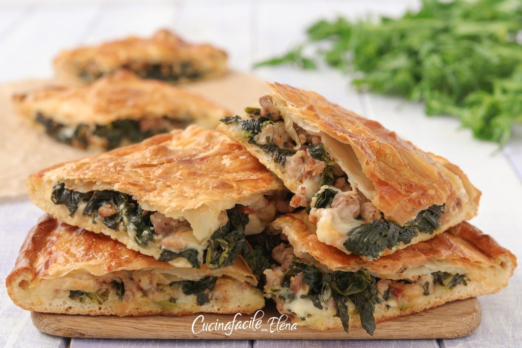 Unroll the ready pizza base, top with the sliced scamorza cheese, not too thick, sausage and rapini, and cover with the puff pastry, sealing the edges well and folding them inward.