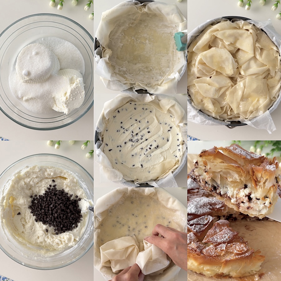 The ricotta phyllo pie with dark chocolate chips is a simple, quick, and truly delicious dessert. You know by now that I love phyllo dough, it’s a base I always keep in the fridge, ready to use at the last minute to prepare both sweet and savory dishes. I had to prepare a very quick dessert for a dinner with friends, and I thought of making a pie with phyllo dough, filled with ricotta cream. How delicious! Fragrant, golden, crunchy and with a creamy filling, the ricotta phyllo pie is really special, perfect at the end of a meal, for breakfast or a snack. I’m sure you’ll fall in love at first bite!