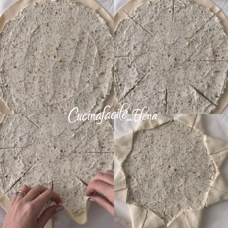 Make 8 small cuts, as if you want to cut out slices, but without reaching the center. Take two small pieces of pastry close to each other and fold them inward to form a point; repeat this operation 8 times to get a little star with 8 points.