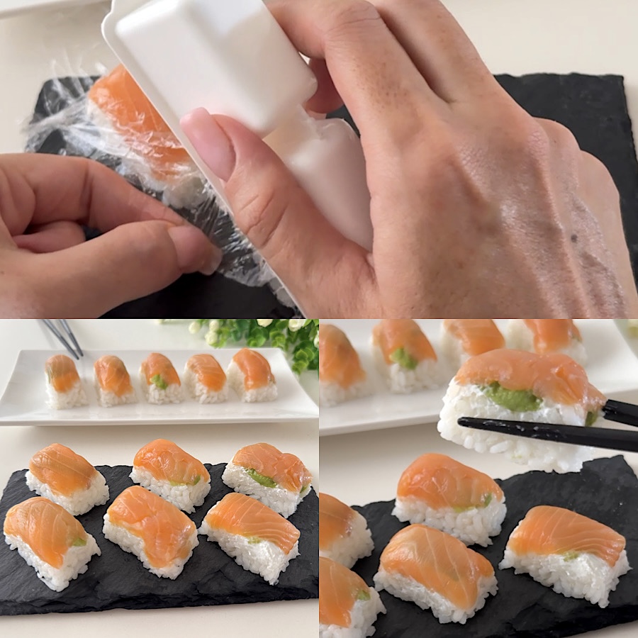 Once all the molds are filled, unmold the smart sushi onto a plate and serve it. It’s ready to enjoy immediately, no need to rest!