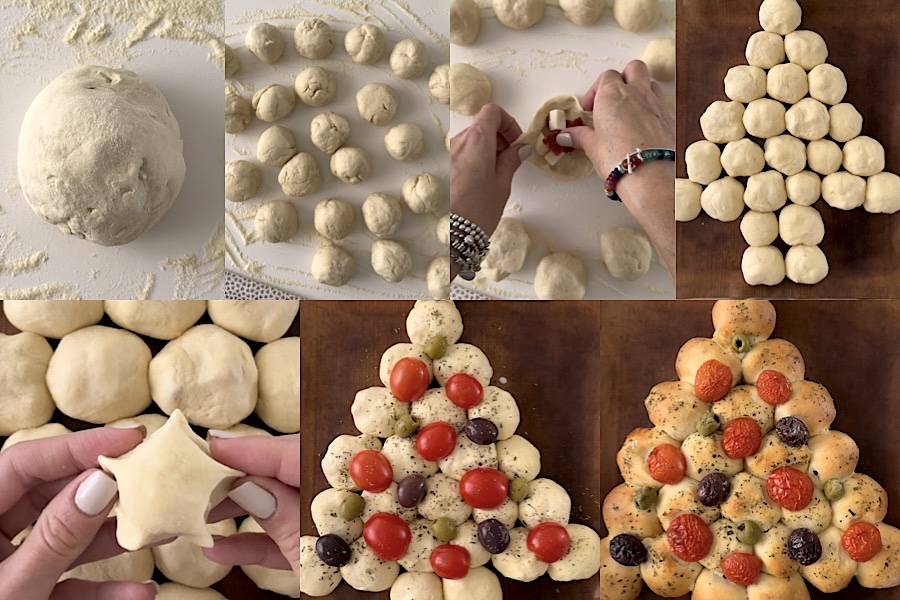 • After stuffing them all, arrange the rolls on a sheet of parchment paper to form a Christmas tree and create a star at the top of the tree by pinching one ball with your fingers to create 5 points, thus forming a star.