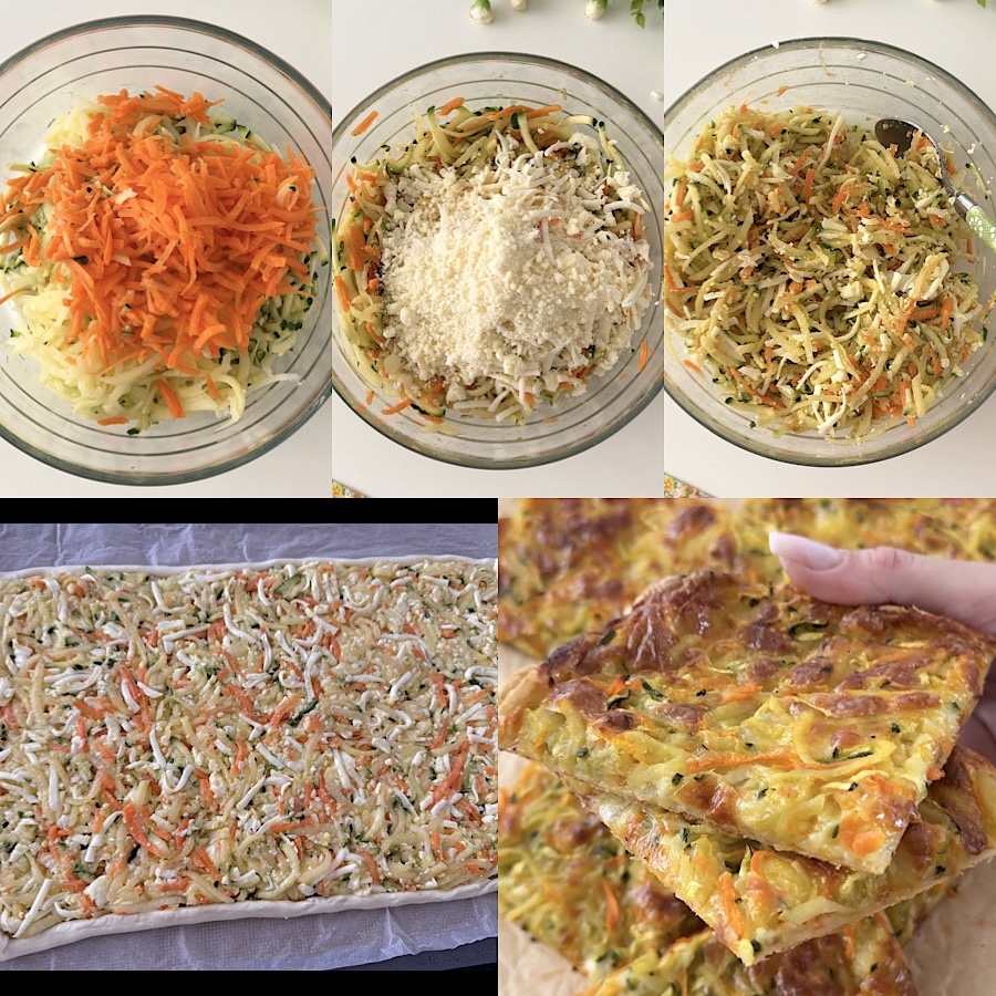 The vegetable and cheese puff pastry is super easy and quick to prepare. First, clean the vegetables, peel the carrots and potatoes, and grate them with a coarse grater. I used one medium zucchini, one medium potato, and two small carrots, with a total weight of approximately 1.1 lbs, as indicated in the ingredients list.