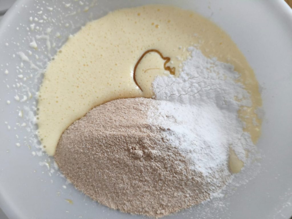 Beat the eggs with the sugar until you get a light and fluffy mixture. Add the oil and oat milk.