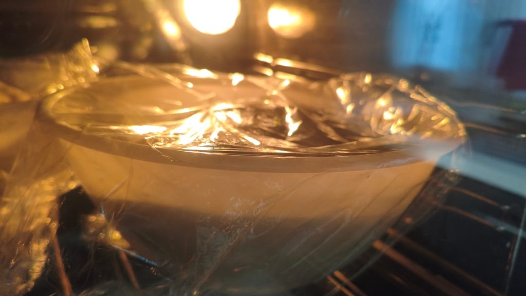 Let it rise covered with plastic wrap in a turned-off oven with the light on for two hours.