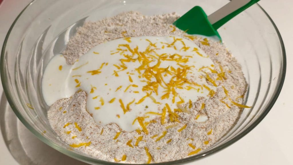 Place the flour with sugar in a bowl and add the kefir (or yogurt) and the lemon zest