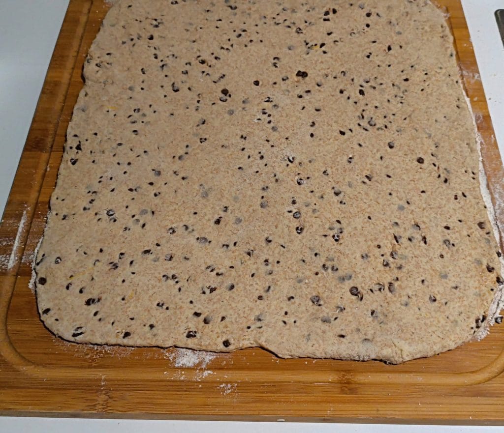 You can leave the dough plain like this or spread hazelnut cream on it. Cut strips about 1.2 inches wide and roll them up.