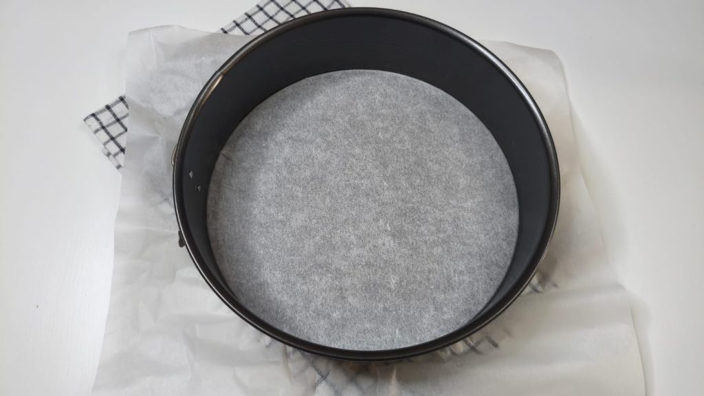 At the base of a springform pan, place a sheet of parchment paper and close it so it remains well stretched. Grease the edge of the pan and cover it with a sheet of parchment paper or acetate cut to size.