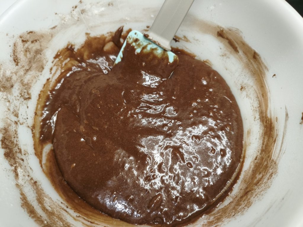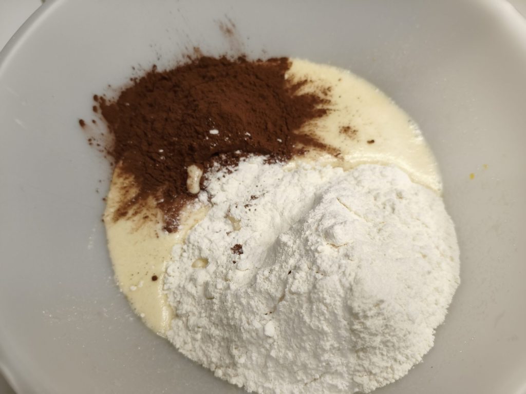 Add dry ingredients Combine sifted flour, baking powder, and cocoa powder. Mix with a spatula from bottom to top to avoid deflating the mixture.