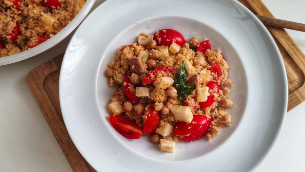 If you’re looking for an easy and tasty idea for a light lunch, try this cold couscous recipe with chickpeas, cherry tomatoes, and lemon. With few ingredients and a simple preparation, you’ll have a delicious and nutritious dish, perfect for any occasion.