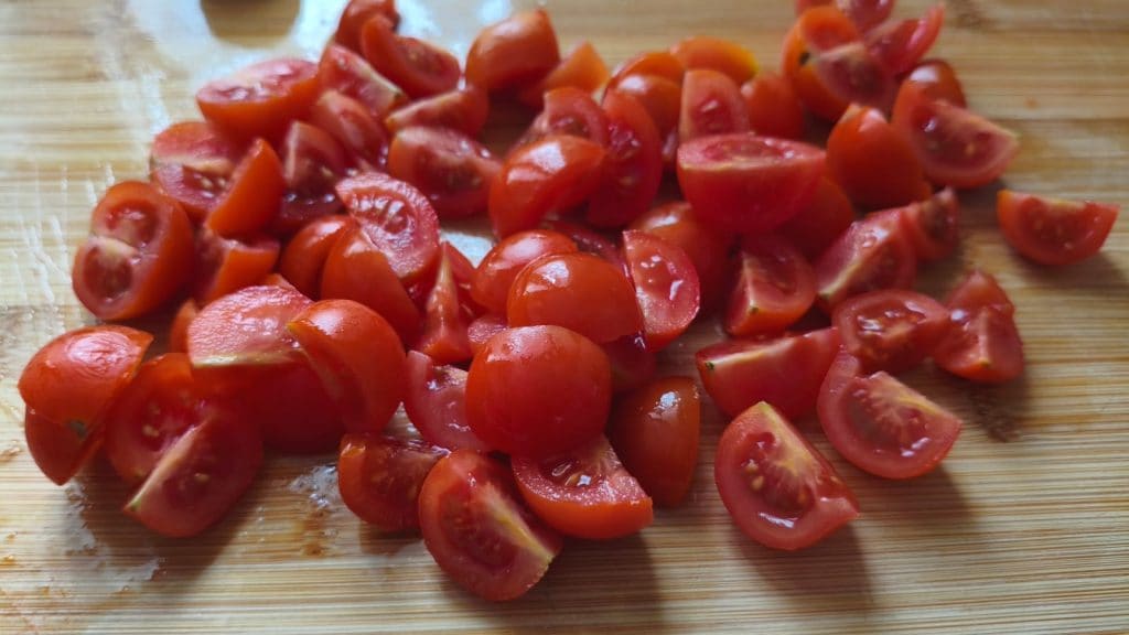 Cut the fresh cherry tomatoes and place them in a large enough bowl. Dress them with oil, a pinch of salt, and basil.