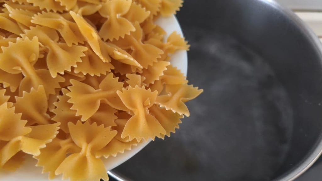 After cooking the pasta and cooling it down, add it to the dressing with a dash of extra virgin olive oil and grated cheese.
