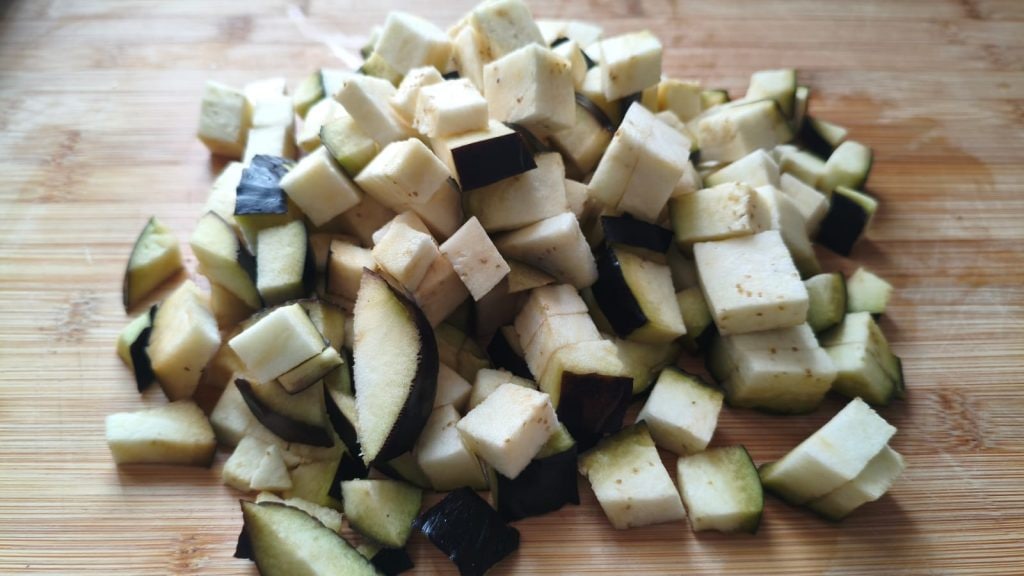 To prepare cold pasta with eggplants and cherry tomatoes, start with the eggplants: wash them, remove the ends, and cut them into cubes. Cook them in a pan with a dash of oil, adjust salt, and add fresh basil.