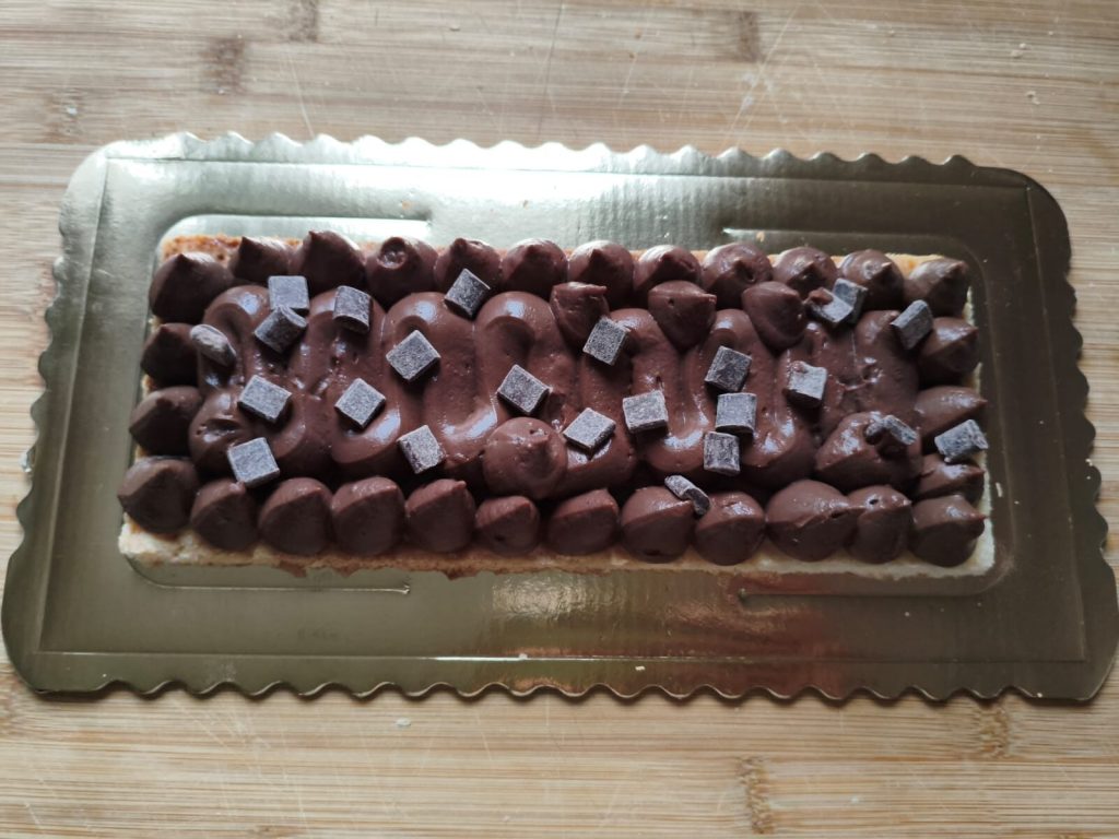 Cover the cream and chocolate millefeuille with the mascarpone chantilly using a spatula or a piping bag.