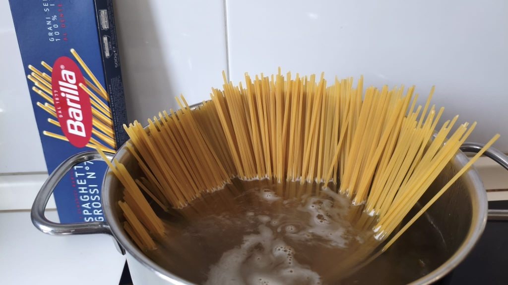 • Add salt and parsley and let them cook until tender. Meanwhile, prepare the carbonara base by mixing the yolks with the cheeses, salt, and optionally pepper.