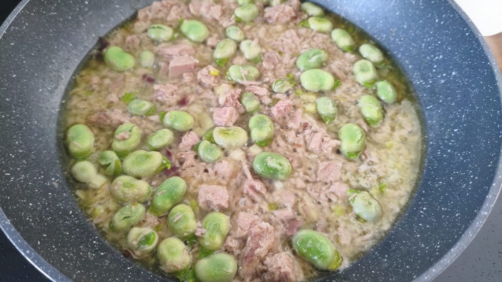 In a pan heat a drizzle of oil with the chopped spring onion. Add the remaining fava beans and the drained tuna. Sauté for a few minutes to develop flavor.