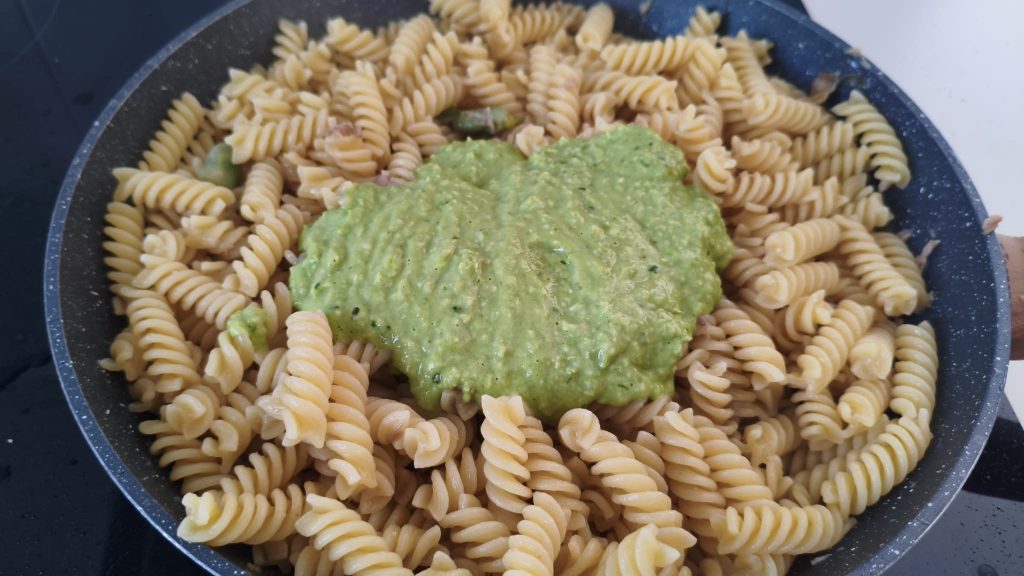 Turn off the heat and add the fava bean cream. Stir until the pasta is creamy and uniform.