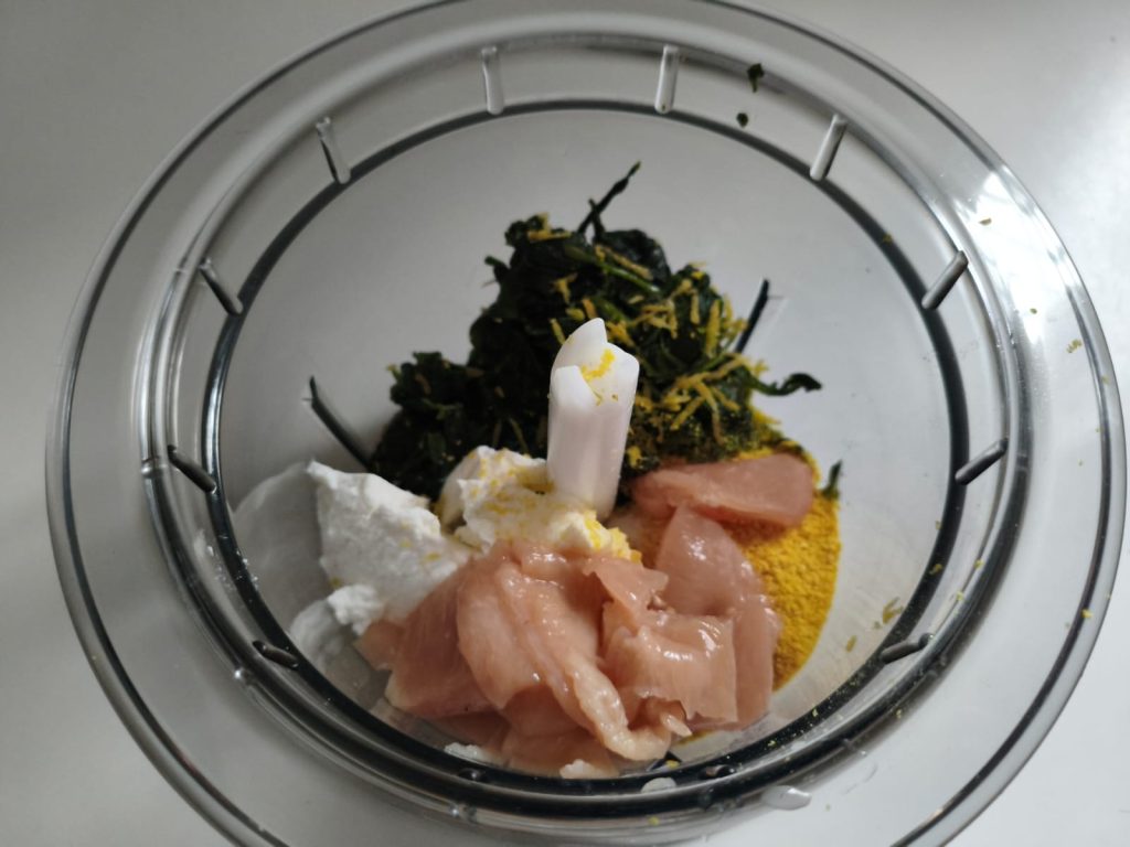 Prepare the mixture: blend the chopped chicken breast with spinach, ricotta, milk, and breadcrumbs in a mixer until you obtain a homogeneous mixture. Season with salt and pepper.
