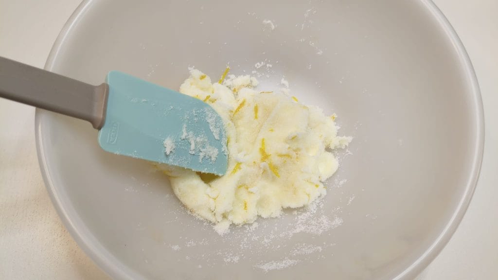 In a bowl, mix butter, sugar, and lemon zest, then add the eggs.