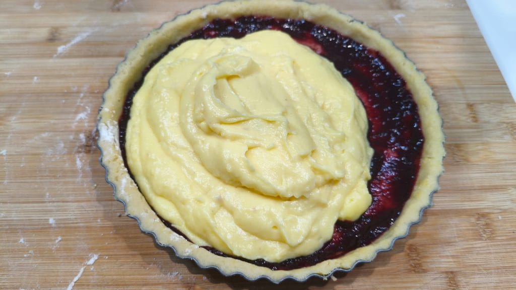 The base is a crumbly shortcrust pastry, which should be left to rest to unleash its full flavor. Once rolled out in the pan, a generous layer of blackberry jam is spread, giving that fruity and slightly tangy touch that balances the sweetness of the custard. The pastry cream, well chilled, is added on top of the jam, creating a velvety embrace between the flavors.
