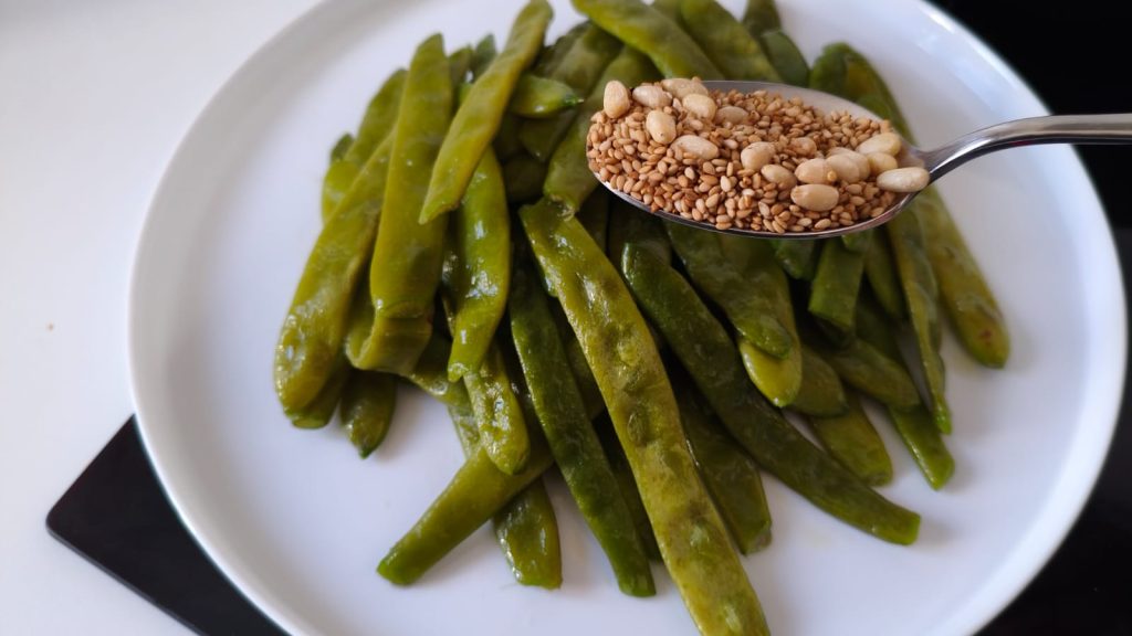 The snow peas, nice and flat and green, are carefully cleaned by removing the ends and the side strings. Then they are boiled in salted water for a few minutes, just enough to soften them while keeping their crunchiness. Meanwhile, a knob of butter is melted in a non-stick skillet: this is where the snow peas get seasoned, becoming shiny and fragrant. The magic touch? Sesame! It’s toasted separately until it releases that irresistible aroma reminiscent of oriental cuisine and comfort. Once ready, it’s sprinkled over the plated snow peas… and voilà, it’s done!