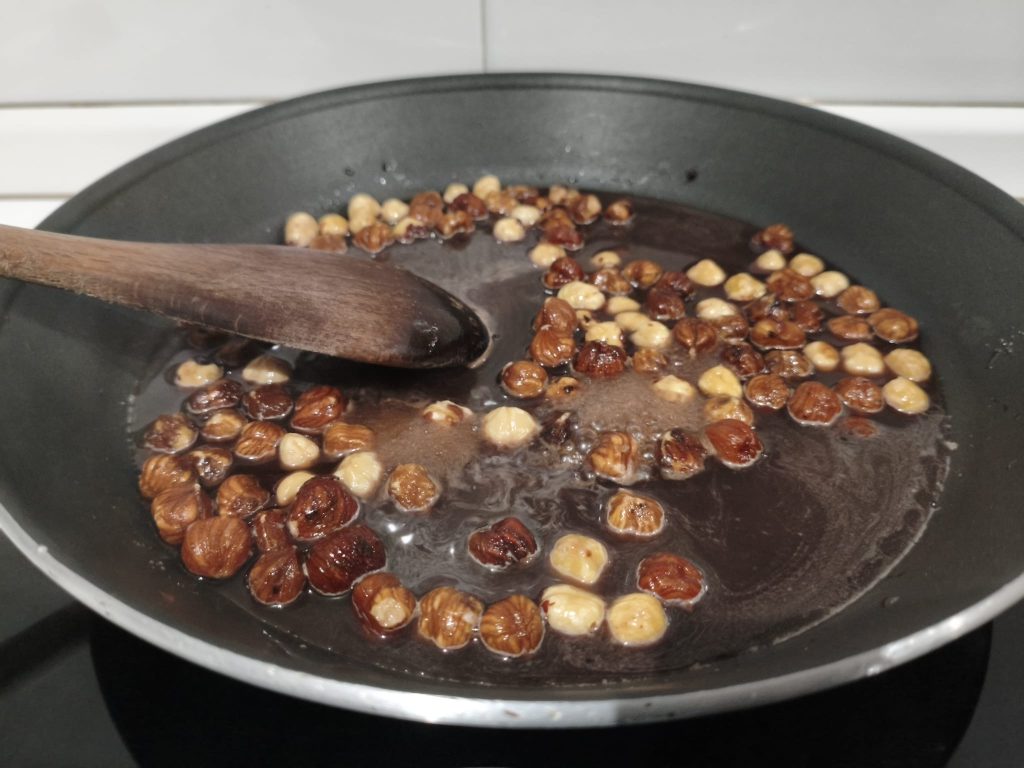 Keep the flame medium-low and stir continuously. It’s important not to rush: the sugar must first melt, then crystallize, and then coat the hazelnuts.