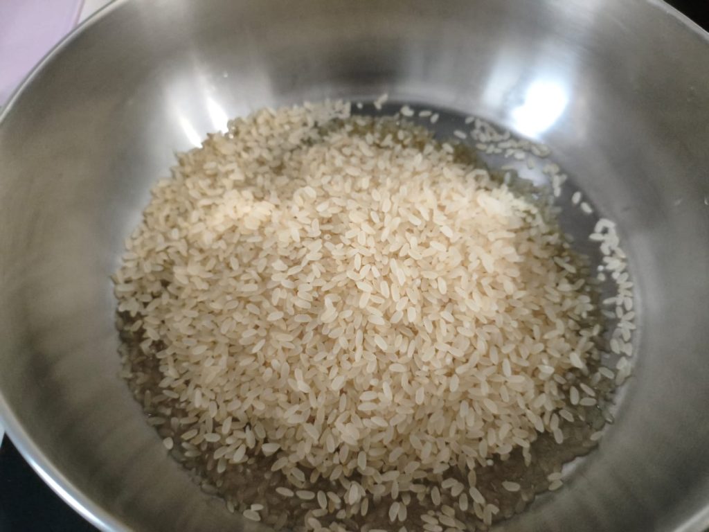 Add the rice and toast it until it becomes glossy.