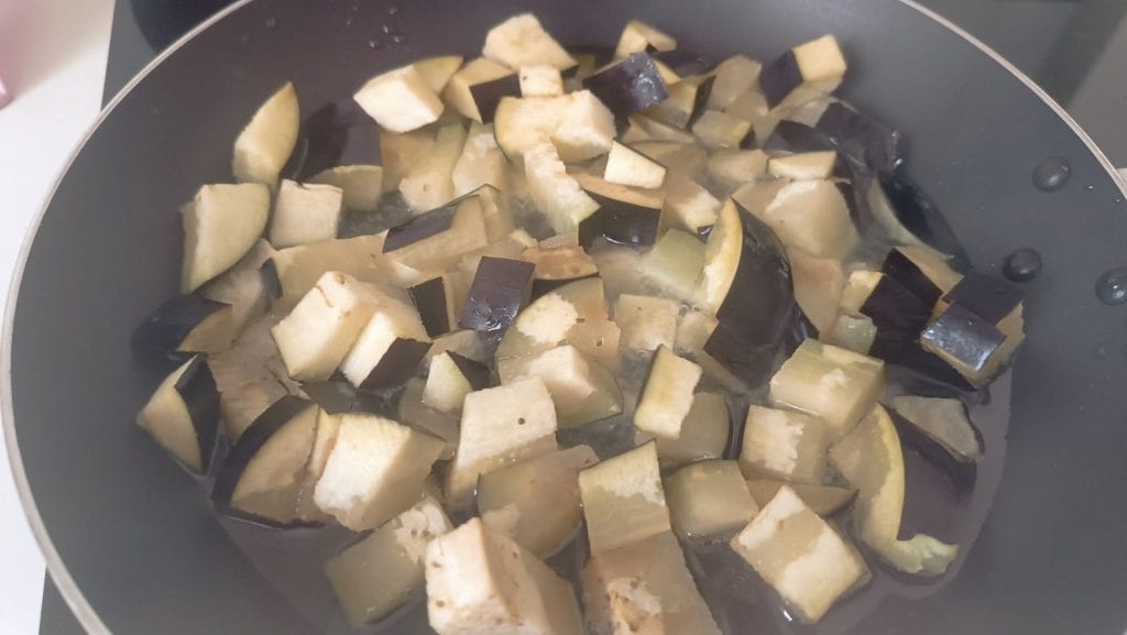 • While the cherry tomatoes are cooking, cut the eggplants into cubes