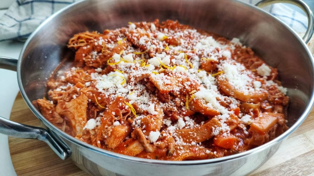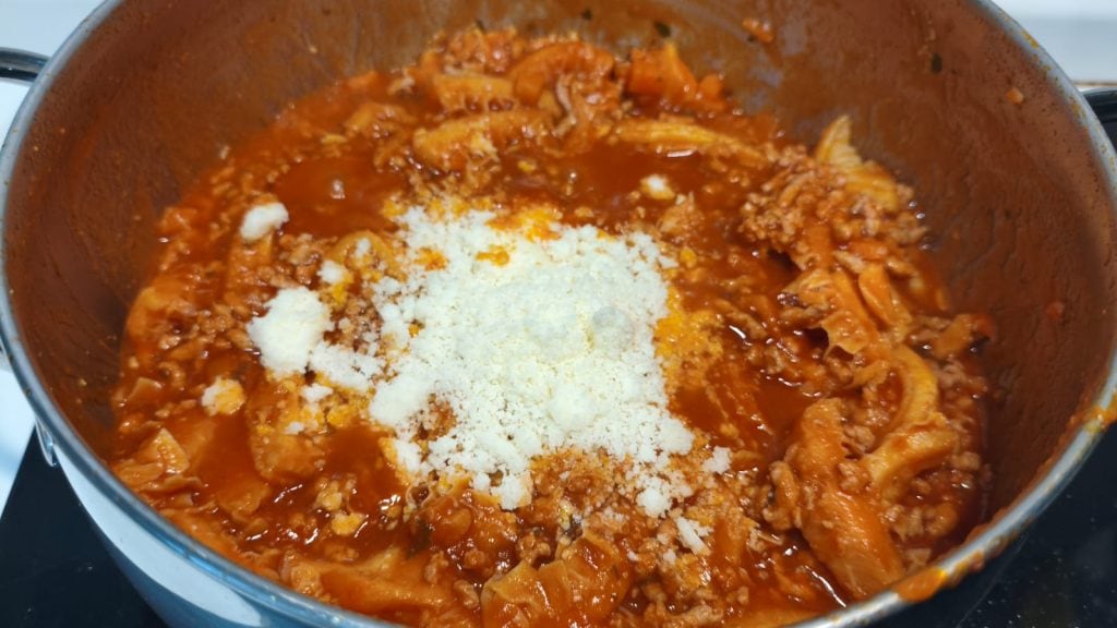 The preparation is really easy: it starts with a classic sofrito of carrot, celery, and onion, which should be well browned to release all its aromas. Once the sofrito is nicely golden, add good ground meat and let it cook. Lastly, thinly sliced tripe. I prefer to let it cook slowly, so it gets well flavored and becomes tender just right. The real magic happens at the end: a generous sprinkle of grated Parmigiano Reggiano and a zest of lemon rind that gives it that unexpected and absolutely irresistible touch of freshness.