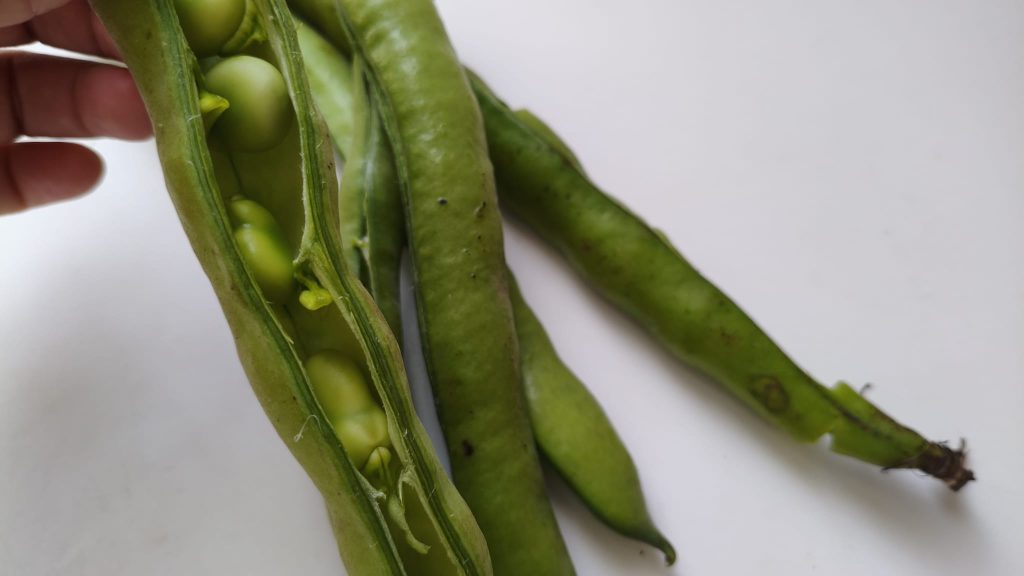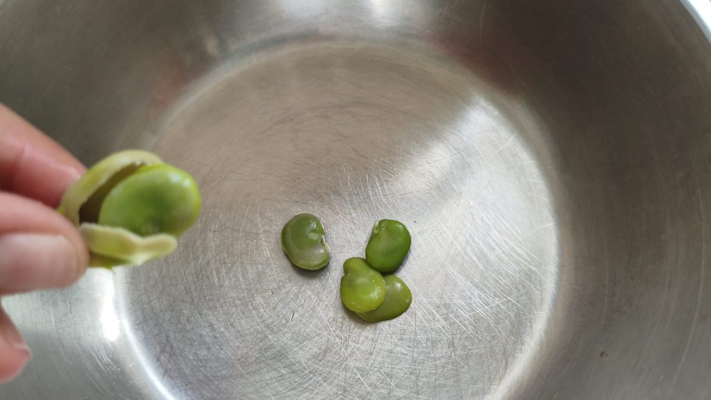 • Open the pods and blanch the fava beans in salted water for 10 minutes. Drain them and cool them in cold water.