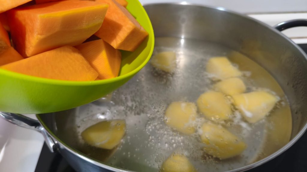 Cook the potatoes in salted boiling water and after 10 minutes add the pumpkin; once cooked, drain and mash both the potatoes and the pumpkin.