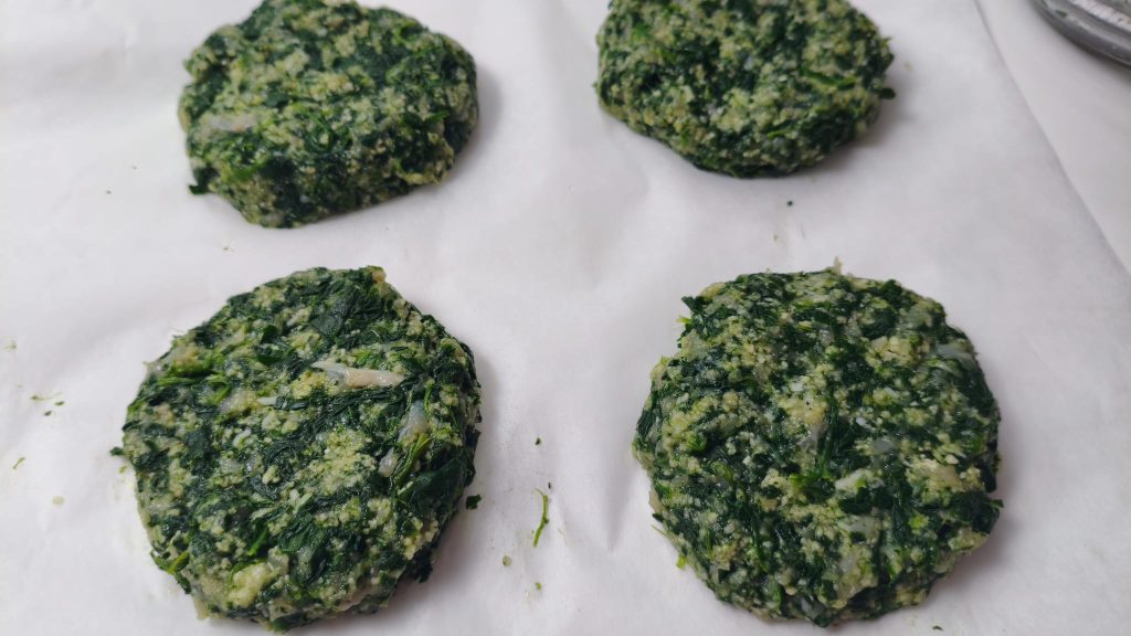 In a bowl combine the chicken, spinach, egg, Parmesan, salt and breadcrumbs. Mix until you get a moldable mixture.