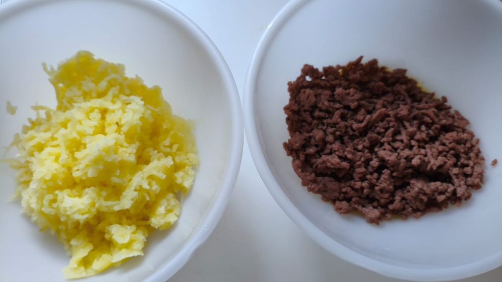 Preparing the meat and potato omelet is very simple: just peel, cut, and wash the potatoes and cook them in salted boiling water.