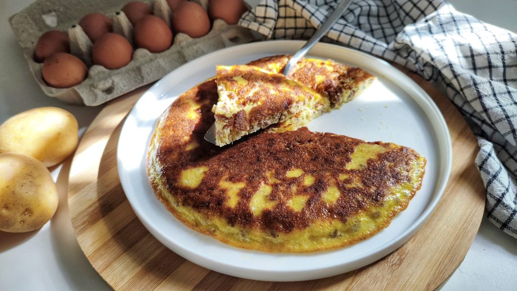 If you want a protein-rich and nutritious omelet, this is the right choice. The meat adds flavor and texture, while the potatoes make it soft and enveloping.