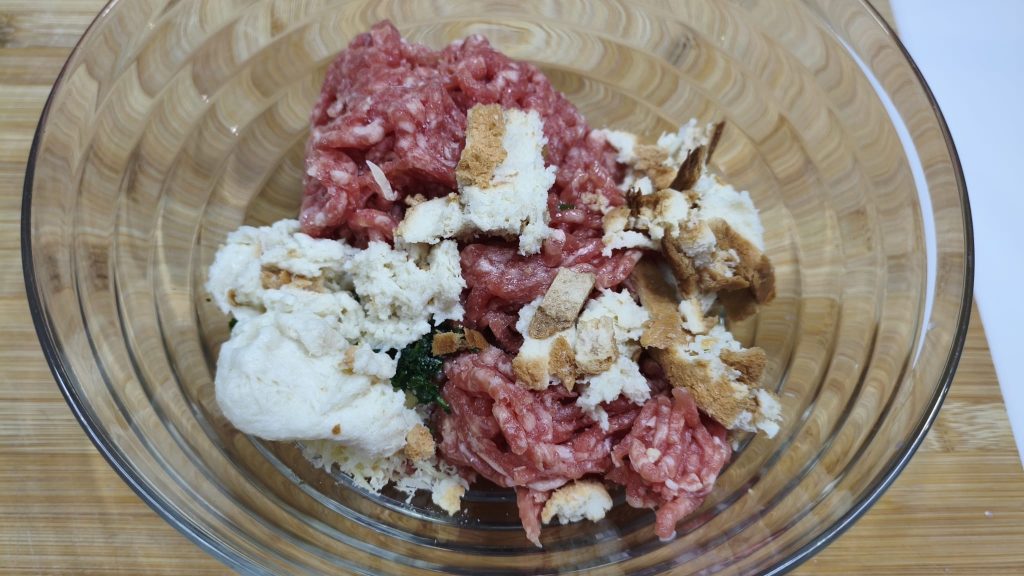 The preparation of the easy and tasty stuffed meatloaf includes using beef or pork minced meat, soaked bread, Parmesan, and spices to enhance the flavor.