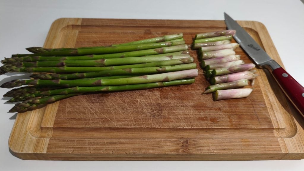Wash the asparagus and remove the woody ends. Cut them, keeping the tips aside.