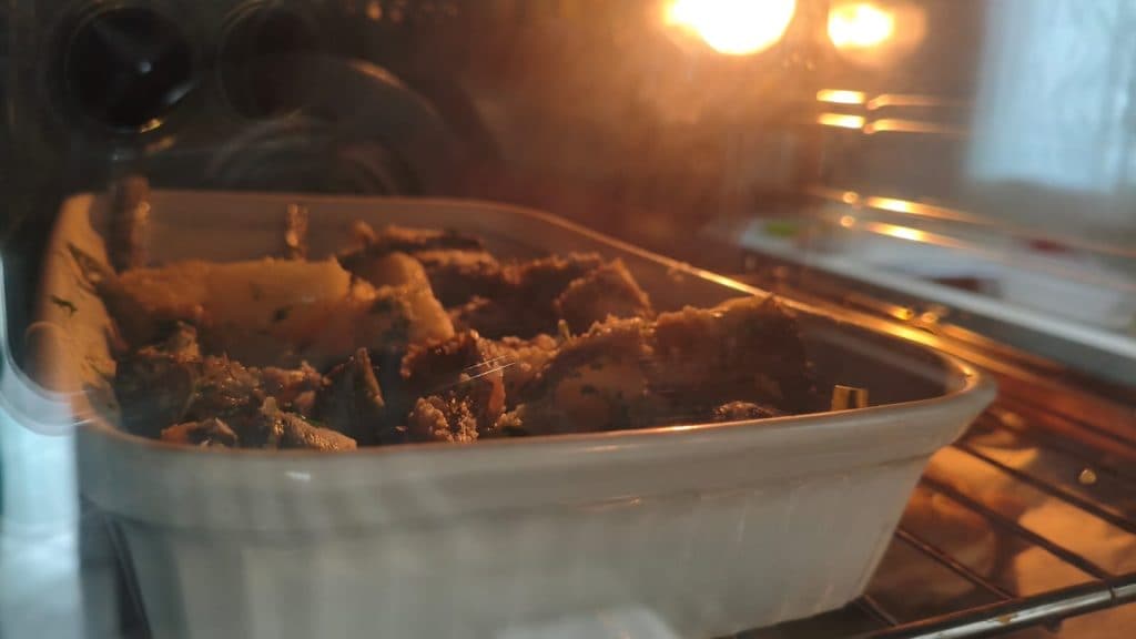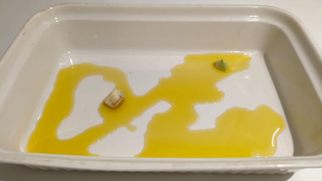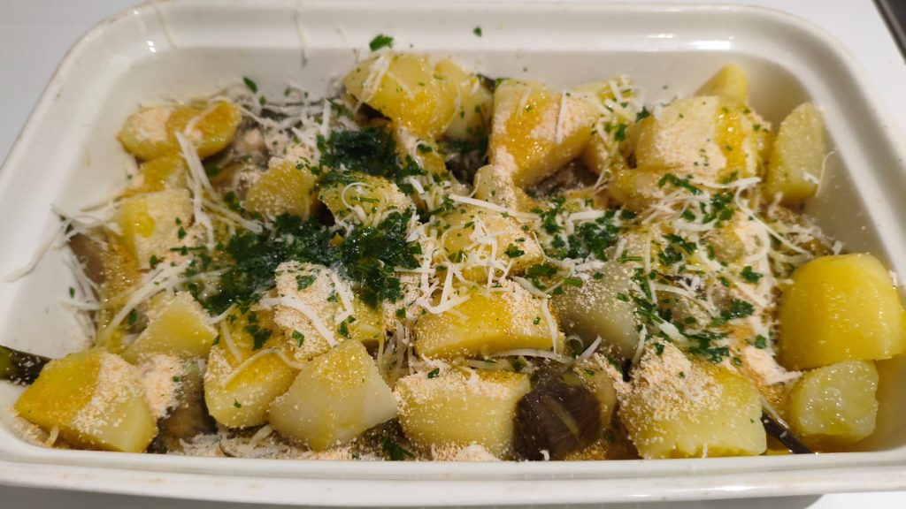 • In a baking dish, place a garlic clove with a drizzle of oil and add the cooked potatoes and artichokes, Parmesan, salt, breadcrumbs, and parsley.
