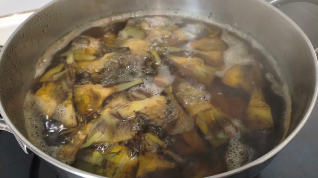 • Place the artichokes in a pan and add enough water to cover them. Cook them for about 15 minutes.