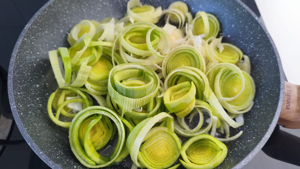 Slice the leeks into rings and cook them in a pan with a splash of water until soft.