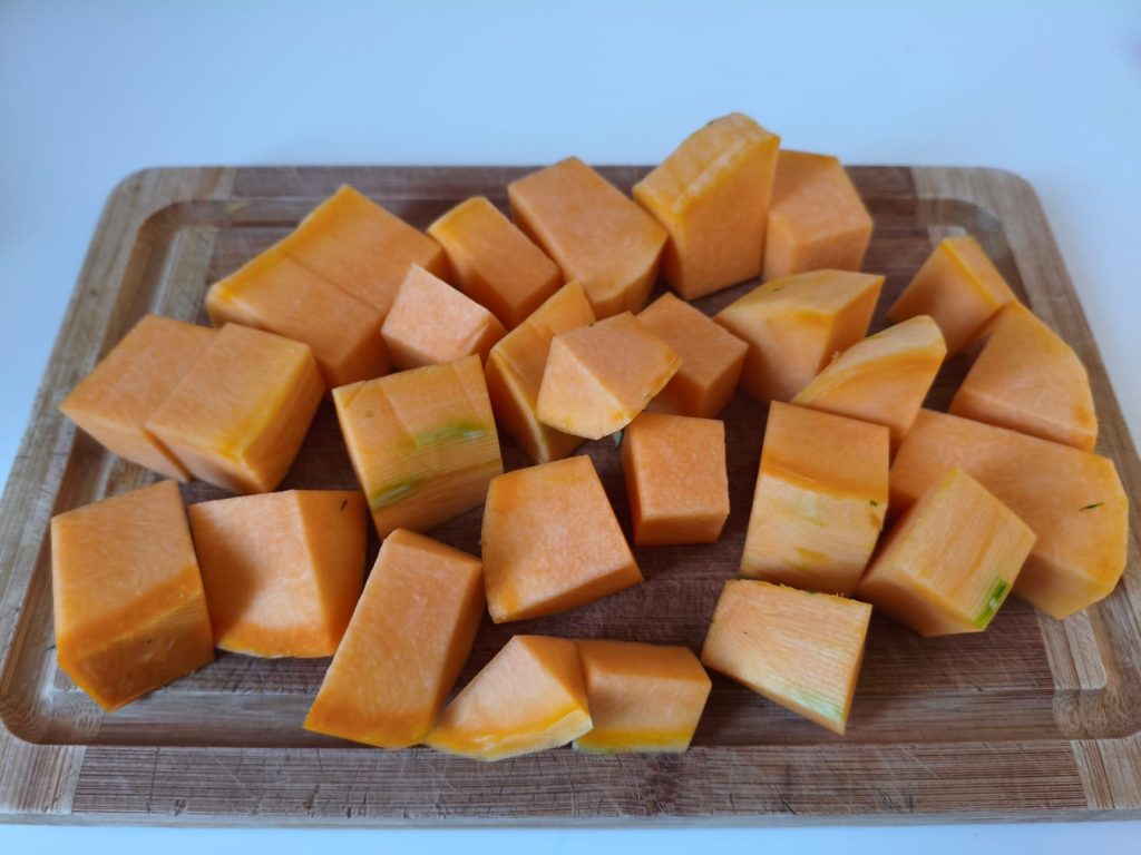 Cut the pumpkin into pieces after removing the skin and inner fibers.