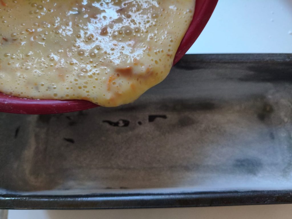 Transfer the batter into a loaf cake mold and sprinkle the remaining half of the floured chocolate chips on top to prevent them from sinking during baking.