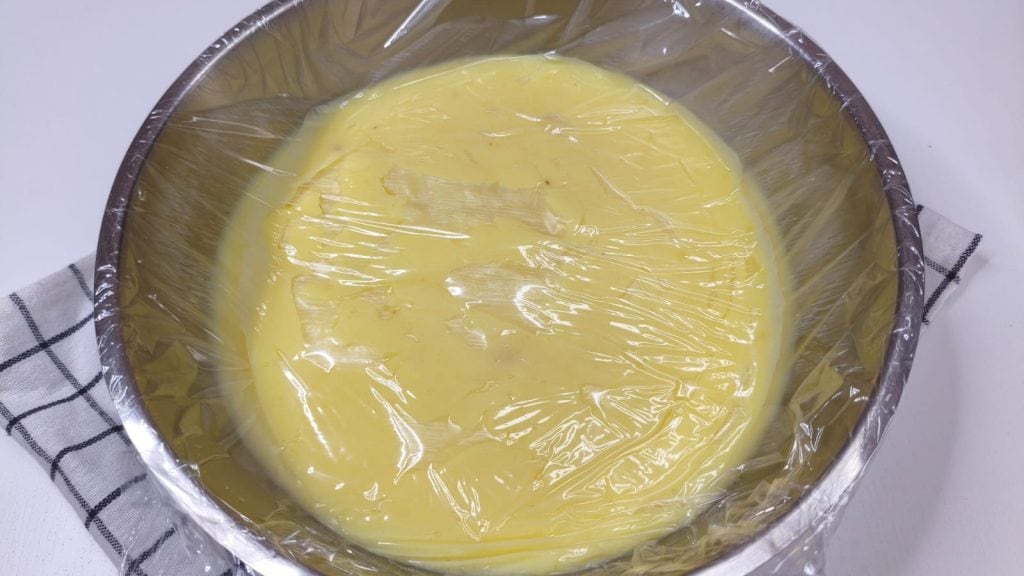 While the pastries are baking, prepare the cream by combining the yolks with the sugar and mixing.