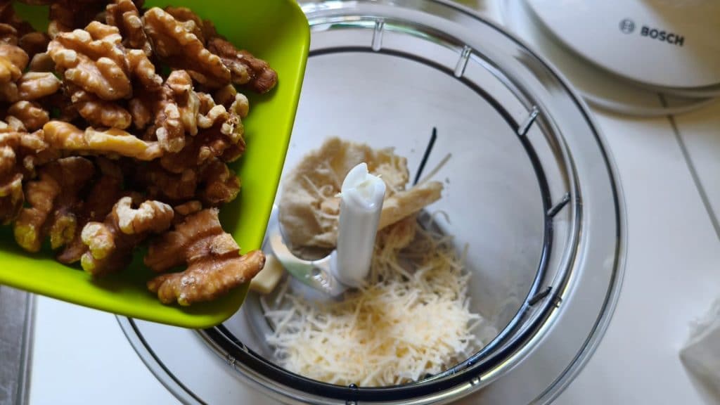 Squeeze the bread and place it in a mixer along with the Parmigiano, salt, garlic, and walnuts.