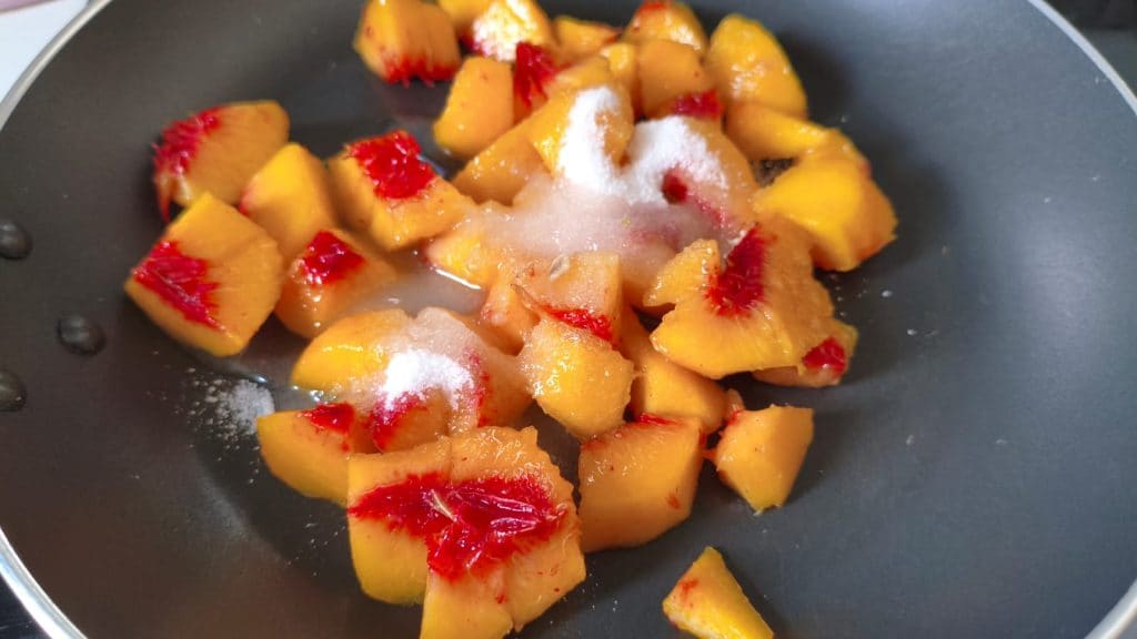 • Add the peaches to a pan with lemon juice and sugar. Cook for a few minutes until they caramelize.
