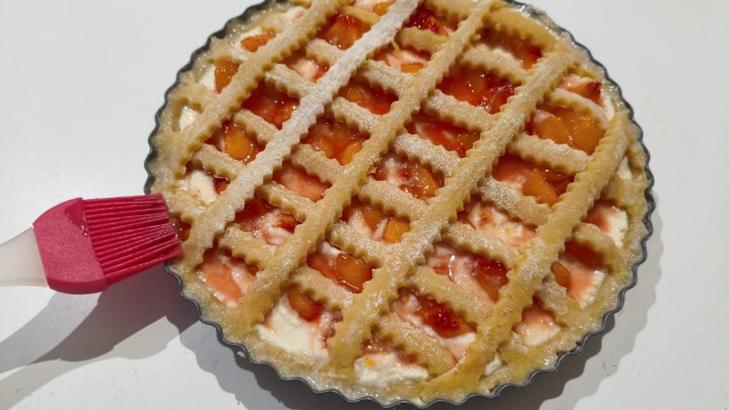 At this point, roll out the remaining shortcrust pastry, cut strips, and place them over the ricotta and peach tart.