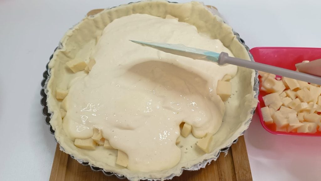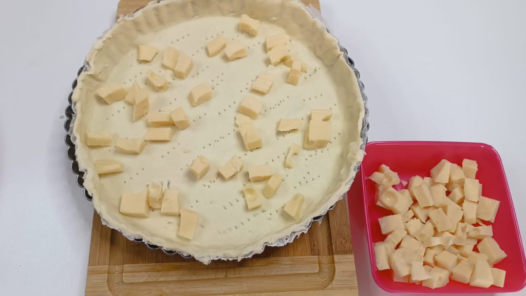 Prick the bottom with a fork and place half of the Emmental cheese cut into cubes.