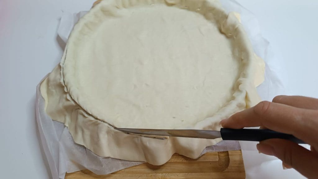 In the meantime, roll out the puff pastry on a cake pan covered with parchment paper and level the edges.