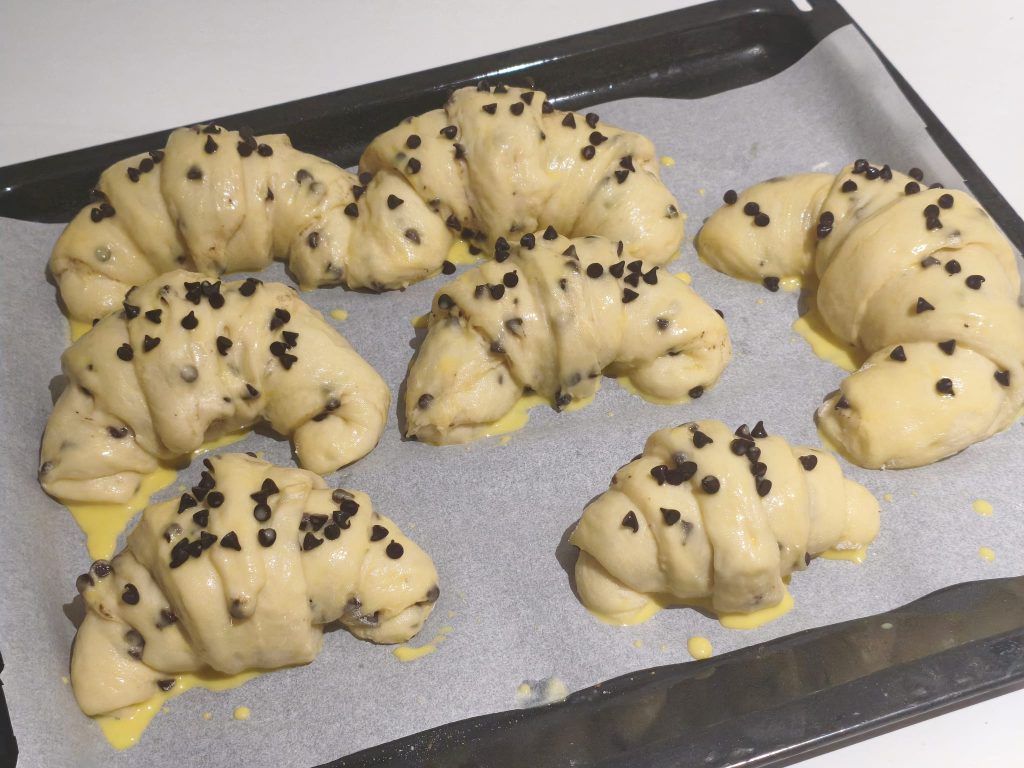 Once risen, brush with a mixture of beaten egg and milk and, if desired, add more chocolate chips.